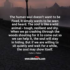 The soul is like a wild animal—tough, resilient, savvy, self-sufficient, and yet exceedingly shy. ~Parker Palmer
