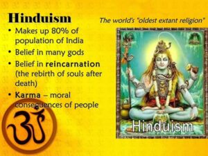 Hinduism is the world’s oldest major religion, a diverse collection of traditions originating in India with no single founder or central authority but unified by shared concepts like dharma, karma, and reincarnation. It involves worship of various deities seen as manifestations of a supreme reality, Brahman, and uses sacred texts such as the Vedas and Upanishads to guide followers toward spiritual liberation. The term “Hinduism” emerged in the 19th century.